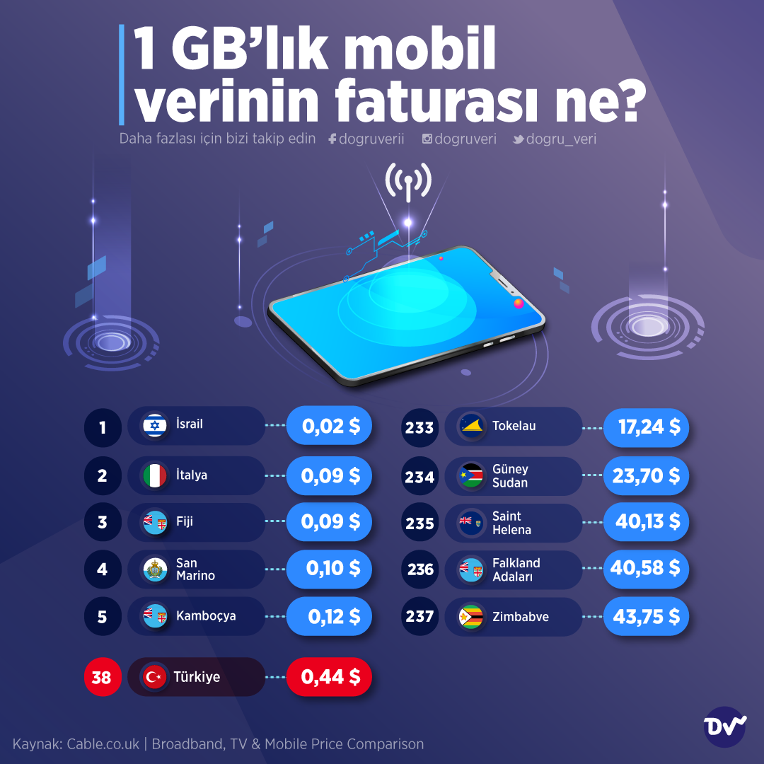 AnasayfaBilim & Teknoloji1 GB mobil veri dünyada ne kadar?Bilim & TeknolojiÜretim & Tüketim 1 GB mobil veri dünyada ne kadar? Paylaş Telefonlarımızda sürekli kullandığımız mobil verilerin 1 gigabyte’lık fatura karşılığını araştırdık. En ucuz fatura İsrail’de bulunurken en pahalı fatura ise Zimbabve’de bulunuyor. Türkiye’de 1 gb’lık mobil verinin karşılığı ise 0,44 dolar. 123 Paylaş