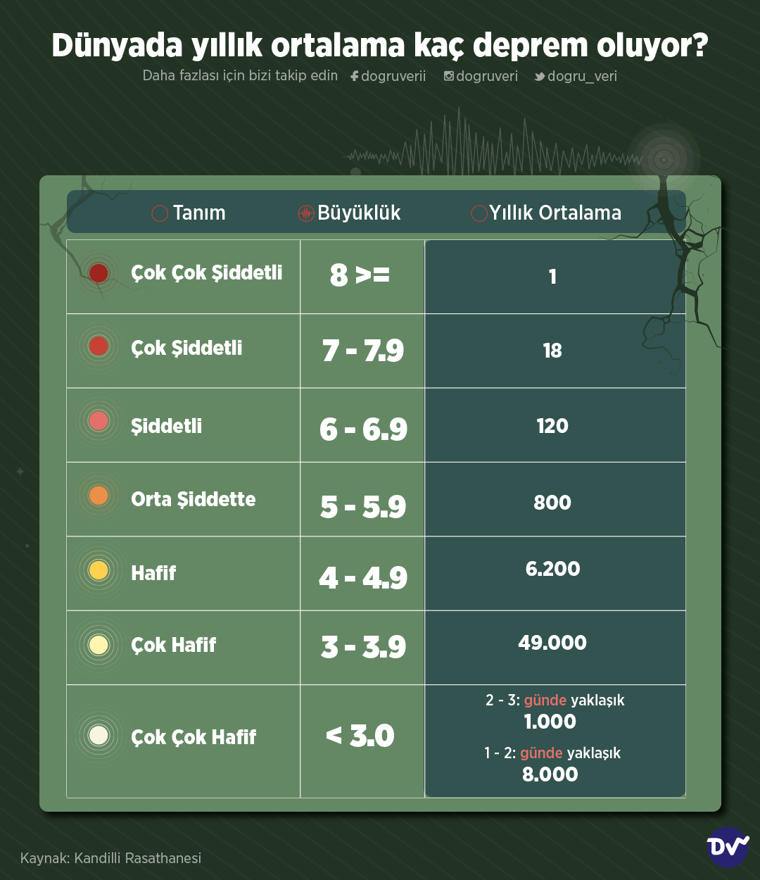 Şiddetlerine göre yıllık ortalama deprem sayılarını derledik. Buna göre, 8 ve 8’den büyük çok çok şiddetli depremlerin yıllık ortalaması 1 iken çok şiddetli depremlerin yıllık ortalaması 18, şiddetli depremlerin yıllık ortalaması ise 120 olarak kaydedilmiş.