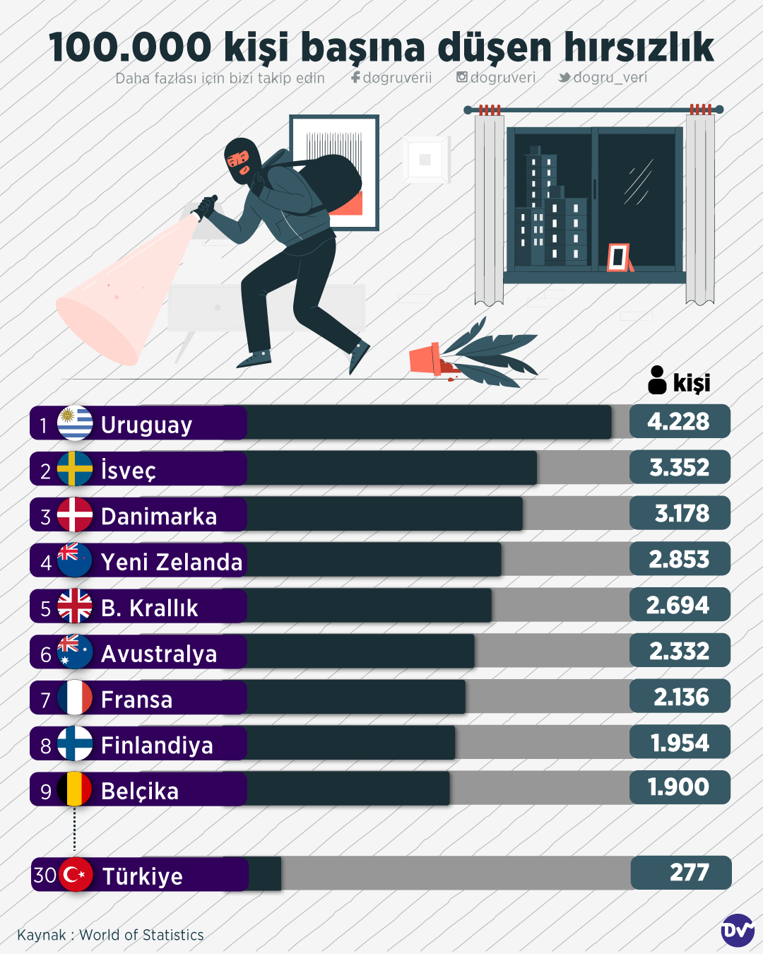 Her 100 bin kişiden kaç kişinin hırsızlığa maruz kaldığını araştırdık. Buna göre listenin başında her 100 bin kişiden 4.228 kişinin hırsızlık ile karşı karşıya kaldığı Uruguay yer alıyor. Uruguay’ı İsveç ve Danimarka takip ediyor. Türkiye’de ise 100 bin kişiden 277 kişi hırsızlık olayı ile karşılaşıyor.