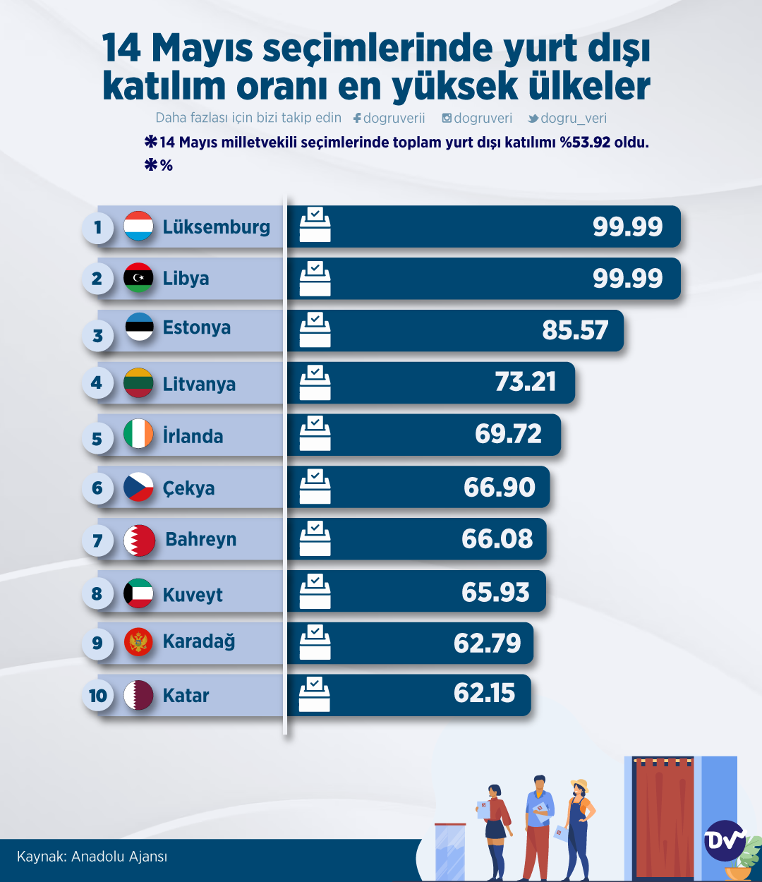 Anadolu Ajansı’nın 14 Mayıs seçimlerine ilişkin verilerinden yurt dışı katılım oranı en yüksek ülkeleri inceleyip listeledik. Buna göre Lüksemburg ve Libya en yüksek katılımı gösteren iki ülke olarak karşımıza çıkıyor.