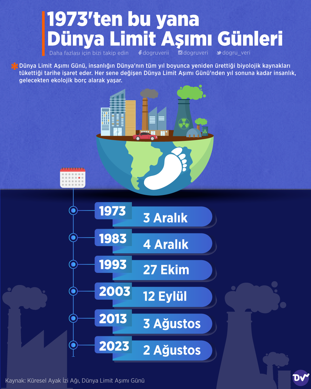 1971’den bu yana belirlenen Dünya Limit Aşımı günü her geçen yıl biraz daha geriye gelerek kaynakları tüketmeye ne kadar yaklaştığımızı gözler önüne seriyor. Dünya Limit Aşımı Günü, insanlığın Dünya’nın tüm yıl boyunca yeniden ürettiği biyolojik kaynakları tükettiği tarihi ifade ediyor. Bu tarih her sene değişiyor ve bu tarihten itibaren insanlık, gelecekten ekolojik borç alarak yaşıyor. 2023’te ise bu tarih 2 Ağustos olarak belirlendi.
