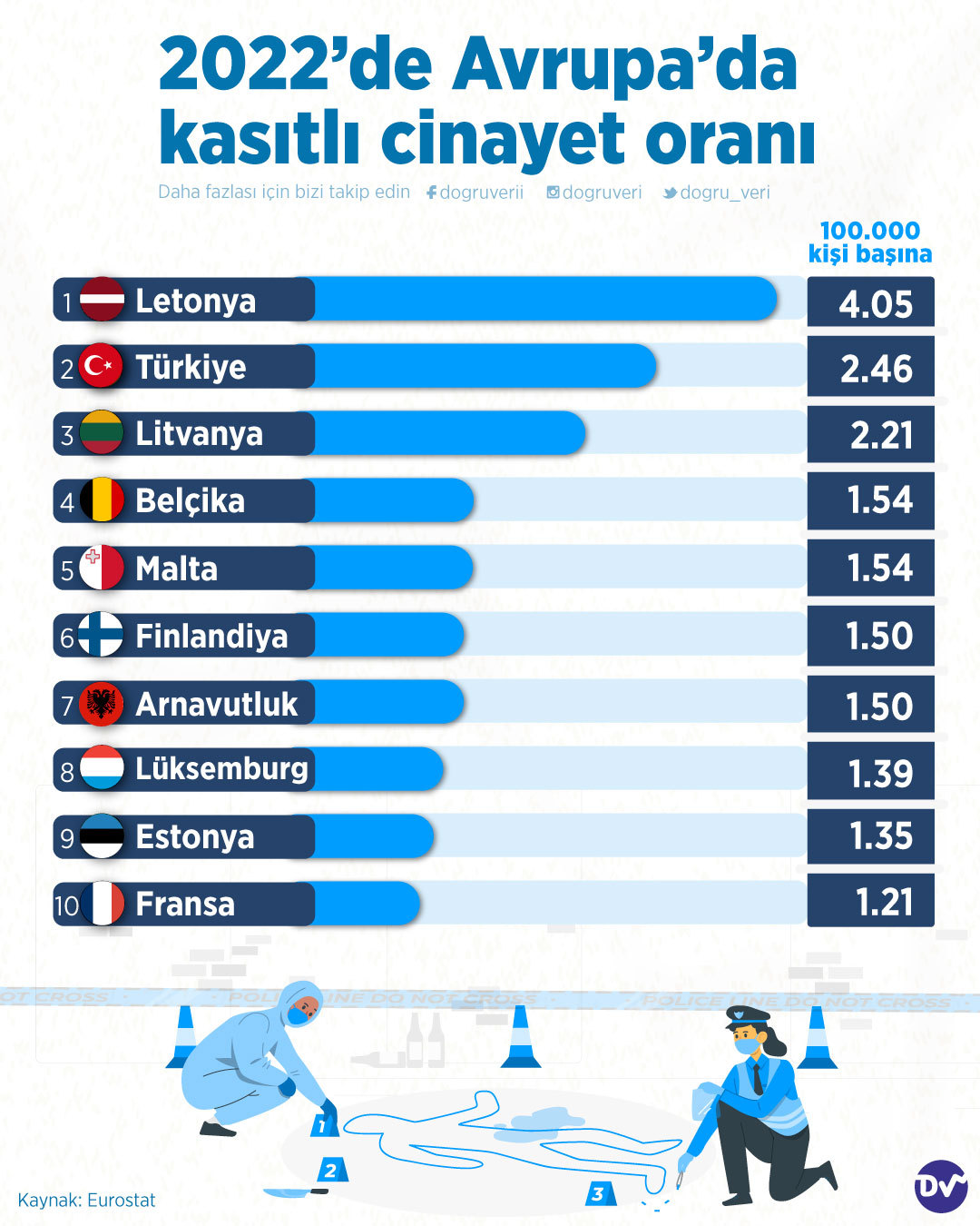 2022 yılında Avrupa ülkelerinde gerçekleşen kasıtlı cinayet suçunun oranlarını araştırdık. Eurostat’tan aldığımız verilere göre Letonya’da her 100 bin kişiden yaklaşık 4’ü cinayete kurban gidiyor. Bu oran ile Letonya listenin ilk sırasında yer alıyor. Türkiye ise listenin ikinci sırasında bulunuyor.