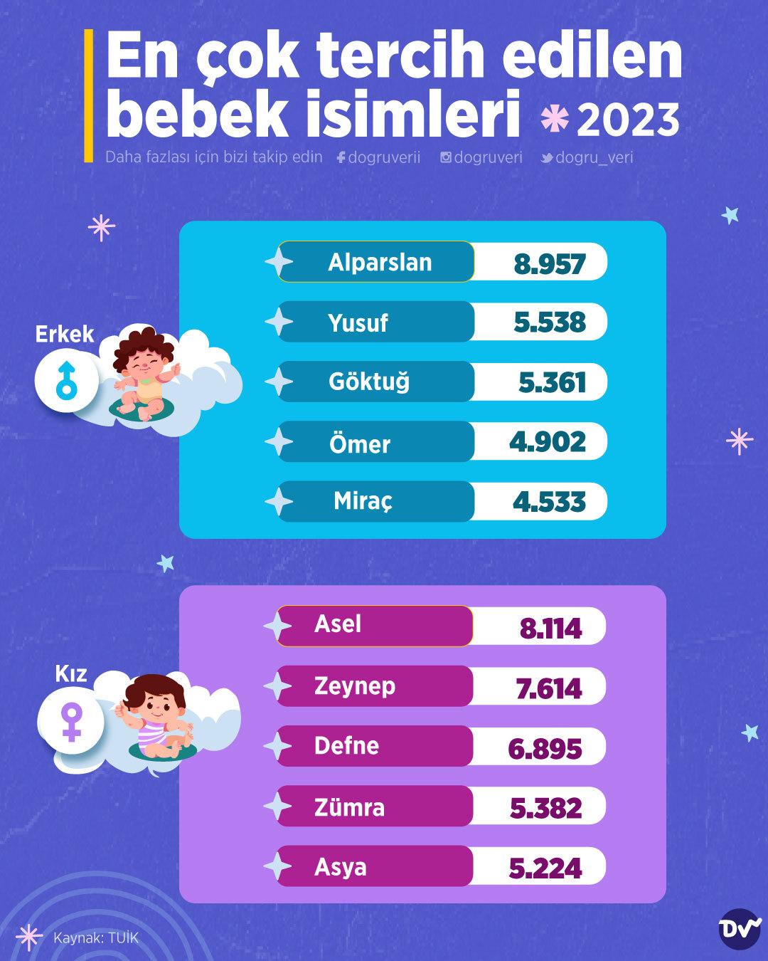AnasayfaNüfus2023’te en çok tercih edilen bebek isimleriNüfus 2023’te en çok tercih edilen bebek isimleri Paylaş TÜİK’ten aldığımız verilere göre 2023 yılında en çok tercih edilen bebek isimlerini derledik. Kız bebeklerde en çok Asel ismi tercih edilirken erkek bebeklerde Alparslan ismi tercih edilmiş. 68 Paylaş