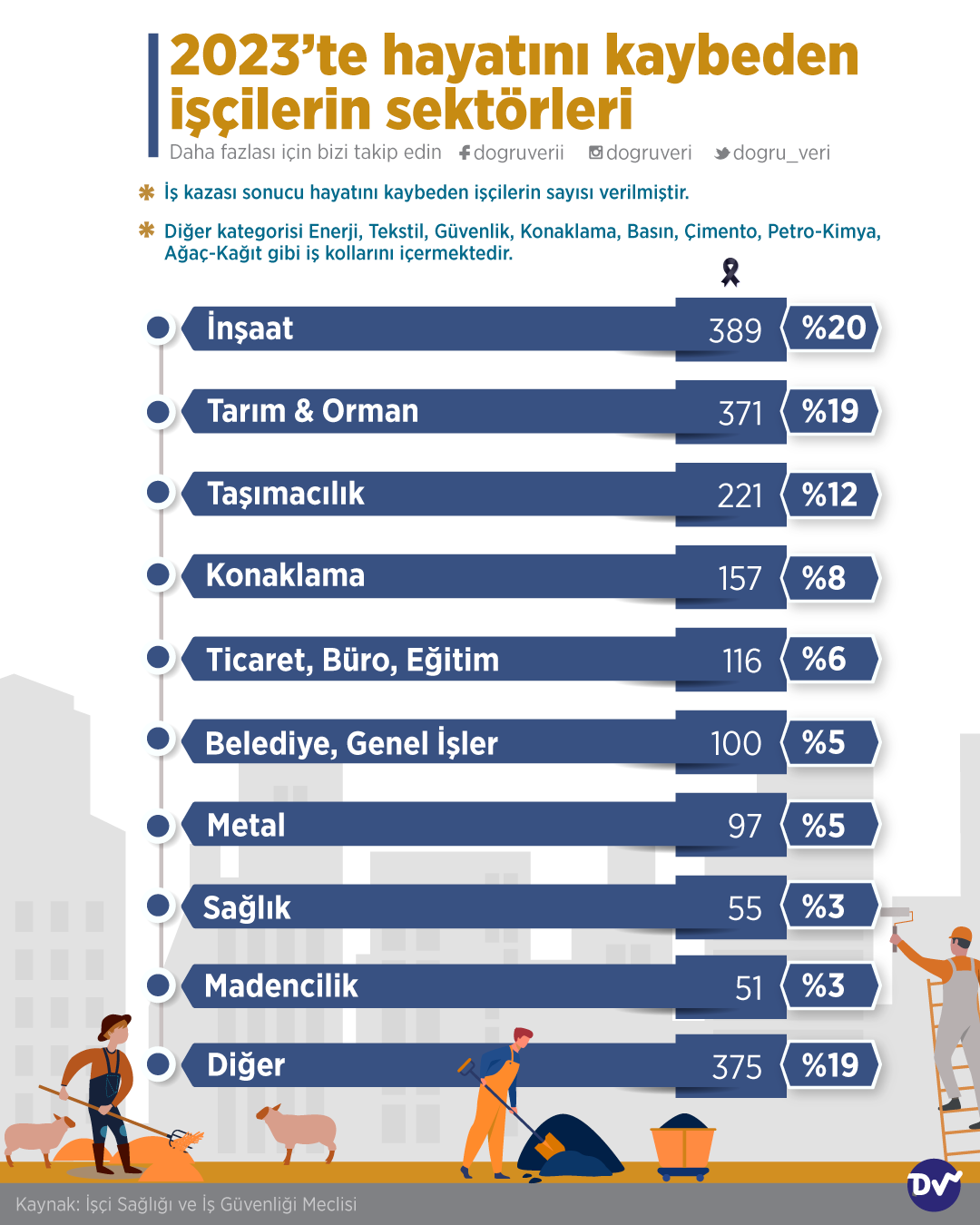 İşçi Sağlığı ve İş Güvenliği Meclisi’nin 2023 raporundan aldığımız verilerle, geçtiğimiz yıl iş kazaları sonucu hayatını kaybeden 1932 işçinin sektörlerini sıraladık. Buna göre 2023’te en çok inşaat, tarım & orman ve taşımacılık sektöründe çalışan işçiler hayatını kaybetmiş.