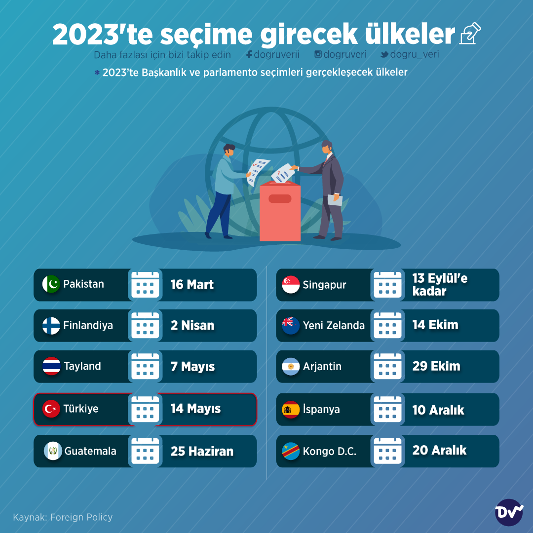 Bu sene genel seçime girecek ülkeleri derledik. Seçimleri yaklaşan ülkeler sırasıyla; Pakistan, Finlandiya, Tayland, Türkiye, Guatemala, Singapur, Yeni Zelanda, Arjantin, İspanya ve Kongo Demokratik Cumhuriyeti. Bugün (10 Mart) yapılan açıklamaya göre, Türkiye’de genel seçimler 14 Mayıs’ta gerçekleşecek.