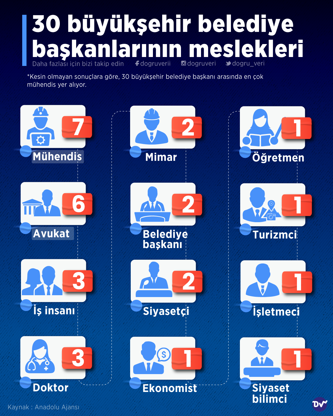 Büyükşehir belediye başkanlarının mesleklerini araştırdık. Derlenen listeye göre, 30 büyükşehir belediyesinin 7’sini mühendis, 6’sını avukat mesleğine sahip olan başkanlar yönetecek. Ayrıca liste içerisinde siyasetçi, öğretmen, işletmeci, ekonomist gibi mesleklere sahip olan başkanlar da bulunuyor.