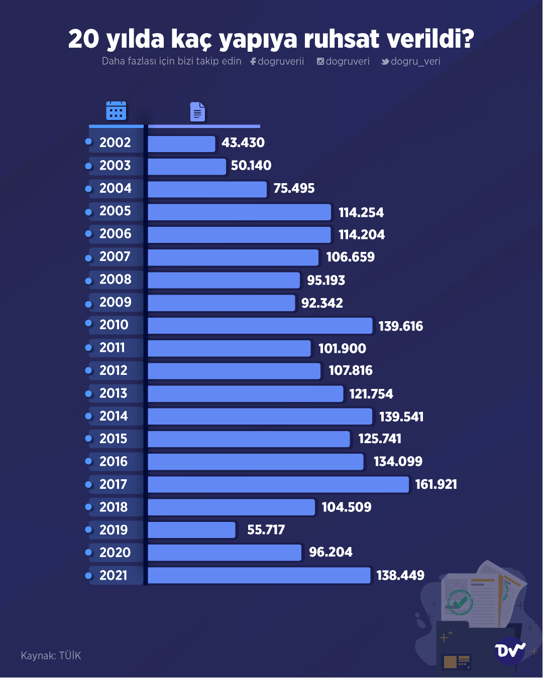 AnasayfaAfet20 yılda kaç yapıya ruhsat verildi?Afet 20 yılda kaç yapıya ruhsat verildi? Paylaş TÜİK’in verilerine göre 2002 ve 2021 yılları arasında ruhsat verilen yapı sayısını derledik. Buna göre en fazla ruhsatın 2017, 2010 ve 2014 yıllarında verildiği görülüyor. 53 Paylaş