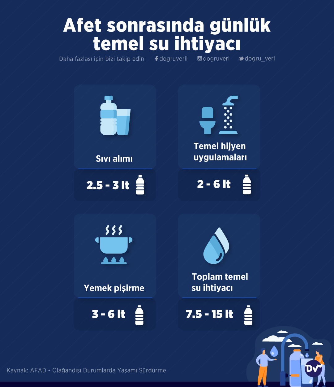 AnasayfaAfetAfet sonrasında günlük temel su ihtiyacıAfet Afet sonrasında günlük temel su ihtiyacı Paylaş Doğal afet durumlarında en fazla ihtiyaç duyulanların başında temiz su ihtiyacı geliyor. Bu sebeple afet sonrasında ihtiyaç duyulan günlük su miktarını derledik. 166 Paylaş