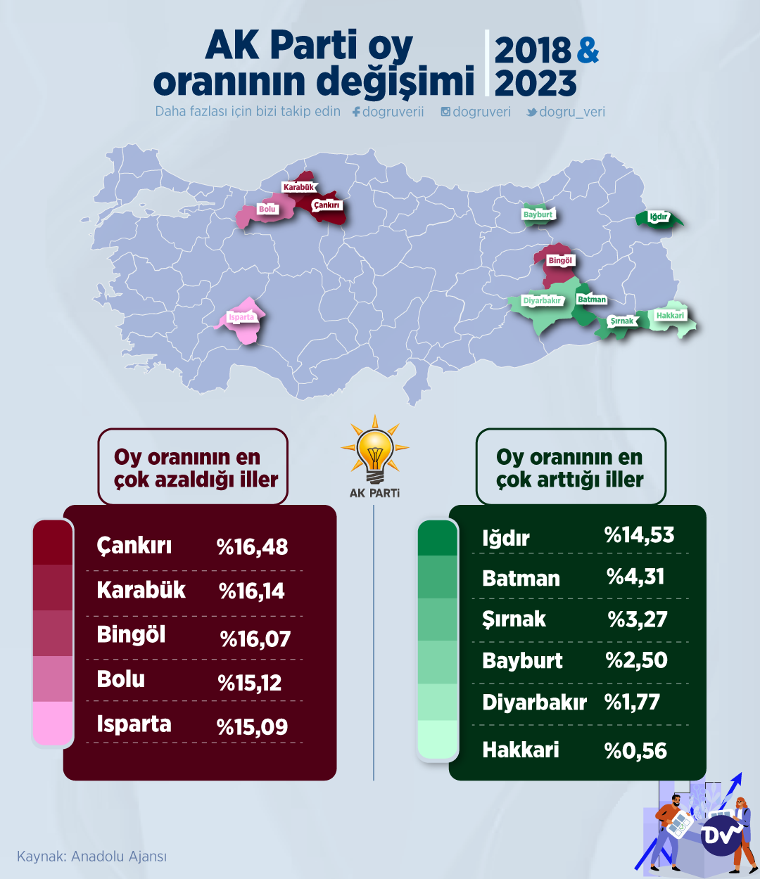 AK Parti’nin 2018 ve 2023 Milletvekili Genel Seçimleri’nde aldığı oy oranlarını karşılaştırdık. Buna göre AK Parti’nin oylarını artırdığı iller Iğdır, Batman, Şırnak, Bayburt, Diyarbakır ve Hakkari olurken oylarını en çok azalttığı 5 il ise Çankırı, Karabük, Bingöl, Bolu ve Isparta oldu.
