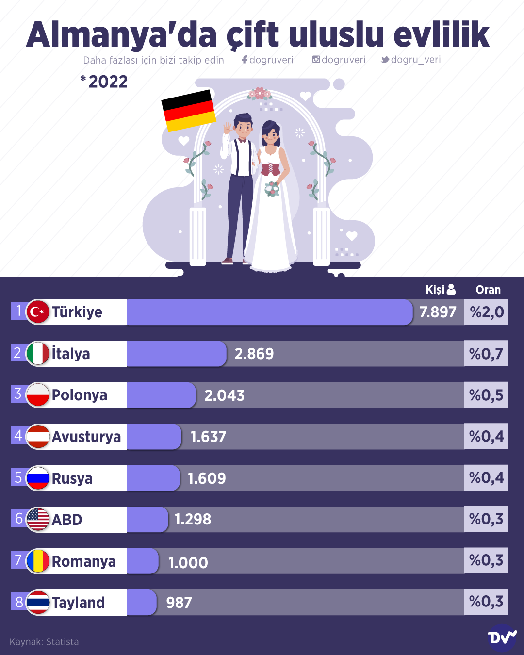 AnasayfaDiğerAlmanya’da çift uluslu evlilik I 2022DiğerNüfus Almanya’da çift uluslu evlilik I 2022 Paylaş Almanlar kendi milleti haricinde en çok Türkiye vatandaşları ile evleniyorlar. Statista’nın verilerine göre Türkiye’nin ardından İtalya ve Polonya geliyor. 75 Paylaş