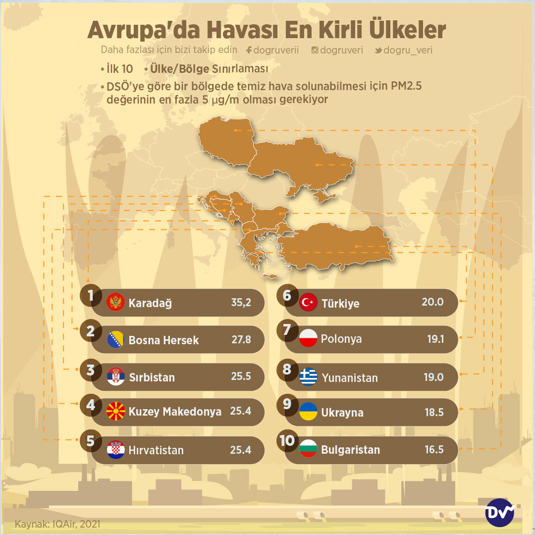 Avrupa‘da havası en kirli olan 10 ülkeyi derledik. Hava kalitesi teknolojisi şirketi IQAir’in verilerine göre, listenin başında 35,2 hava kirliliği değeriyle Karadağ yer alırken ikinci sırada 27,8 ile Bosna Hersek ve üçüncü sırada 25,5 ile Sırbistan bulunuyor. Türkiye, havası en kirli Avrupa ülkeleri arasından 20,0 kirlilik değeriyle 6. sırada yer alıyor.