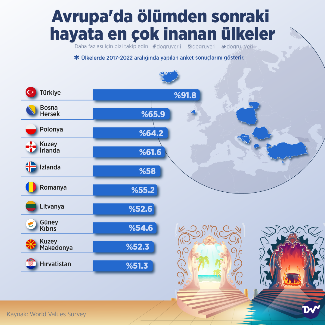 Worls Values Survey’in 2017-2022 aralığında yapılan anket sonuçlarına göre hazırladığı Avrupa’da ölümden sonraki hayata en çok inanan ülkeler listesinde ilk sırada Türkiye yer alıyor. Onu Bosna Hersek ve Polonya takip ediyor.