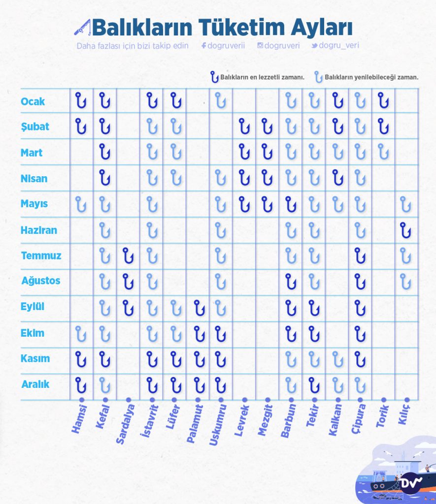 Kış ayları, balık mevsimi olarak bilinse de aslında her mevsim kaliteli balık yenebilir.. Ocak ayında; hamsi, kefal, sardalya, istavrit, tekir ve torik tüketebiliyoruz. Yaz aylarında çeşit sayısı düşse de haziranda kılıç; temmuzda sardalya ve çipura; ağustosta sardalya, barbun ve çipura tüketebilirsiniz.