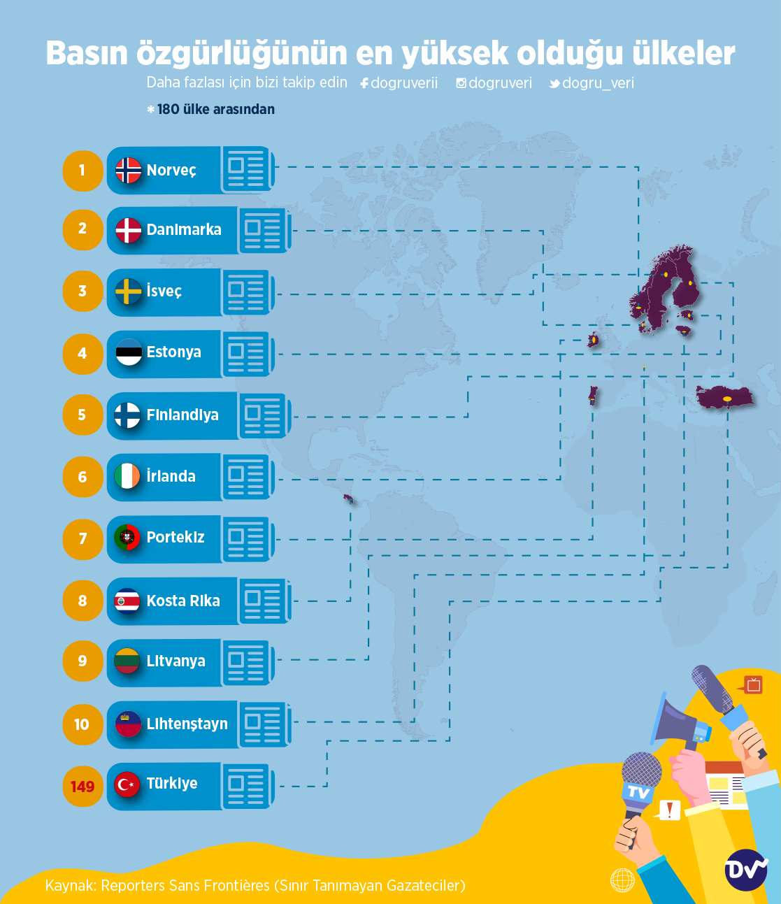 AnasayfaSiyaset & PolitikaBasın özgürlüğünün en yüksek olduğu ülkelerSiyaset & PolitikaHukuk Basın özgürlüğünün en yüksek olduğu ülkeler Paylaş 180 ülke arasından basın özgürlüğünün en yüksek olduğu ülkeleri derledik. Sıralamaya göre basın özgürlüğünün en fazla olduğu ülke Norveç olurken 2. sırada Danimarka, 3. sırada İsveç yer aldı. Türkiye ise listede 149. sırada yer aldı. 173 Paylaş