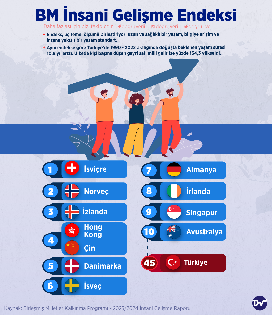 Birleşmiş Milletler Kalkınma Programı – 2023/2024 İnsani Gelişme Raporu’ndan aldığımız veriye göre sağlık bir yaşam, bilgiye erişim ve yaşam standardının en yüksek olduğu ülkelerin başında İsviçre yer alırken Türkiye 45. sırada yer alıyor. Endeks, üç temel ölçümü birleştiriyor: uzun ve sağlıklı bir yaşam, bilgiye erişim ve insana yakışır bir yaşam standart. Aynı endekse göre Türkiye’de 1990 – 2022 aralığında doğuşta beklenen yaşam süresi 10,8 yıl arttı. Ülkede kişi başına düşen gayri safi milli gelir ise yüzde 154,3 yükseldi.