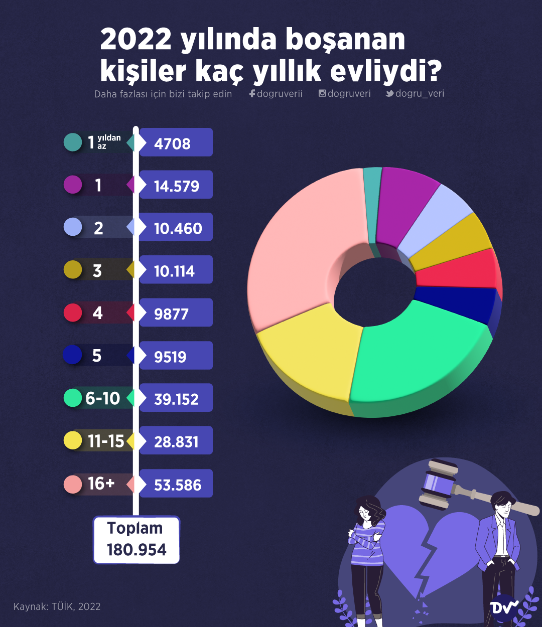 AnasayfaNüfusBoşanan kişiler kaç yıllık evliydi?Nüfus Boşanan kişiler kaç yıllık evliydi? Paylaş 2022 yılında boşanan kişilerin evlilik sürelerine bakıldığında en çok 16 yıl ve üstü yıldır evli olanların boşandığı görülüyor. 77 Paylaş