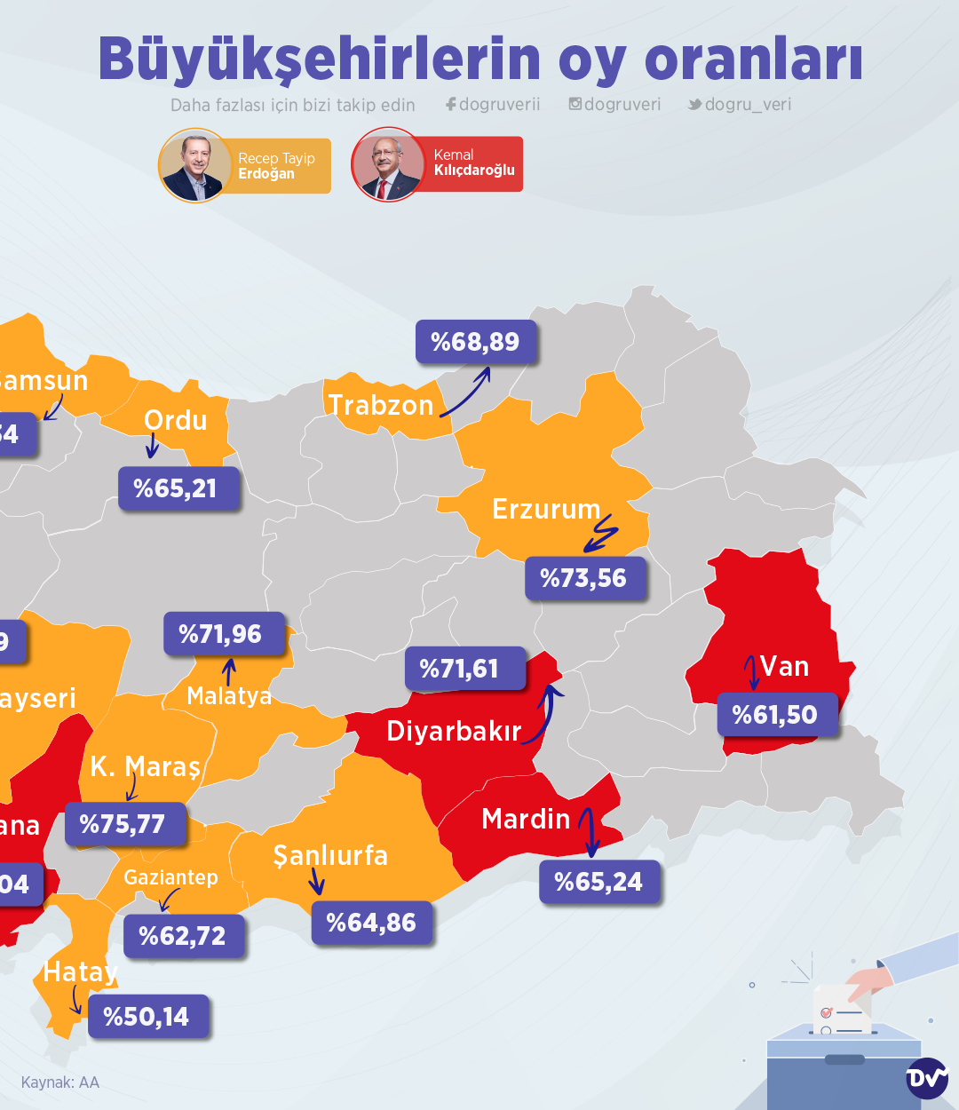 Kesin olmayan sonuçlara göre büyükşehirlerin Cumhurbaşkanlığı seçimlerindeki oy oranlarını derledik. Haritaya bakıldığında ilk tura göre yalnızca Hatay ilinin tercihinin değiştiği görülüyor. 30 büyükşehirden 15 tanesinde Kemal Kılıçdaroğlu, kalan 15 tanesinde de Recep Tayyip Erdoğan seçimi önde bitirdi.