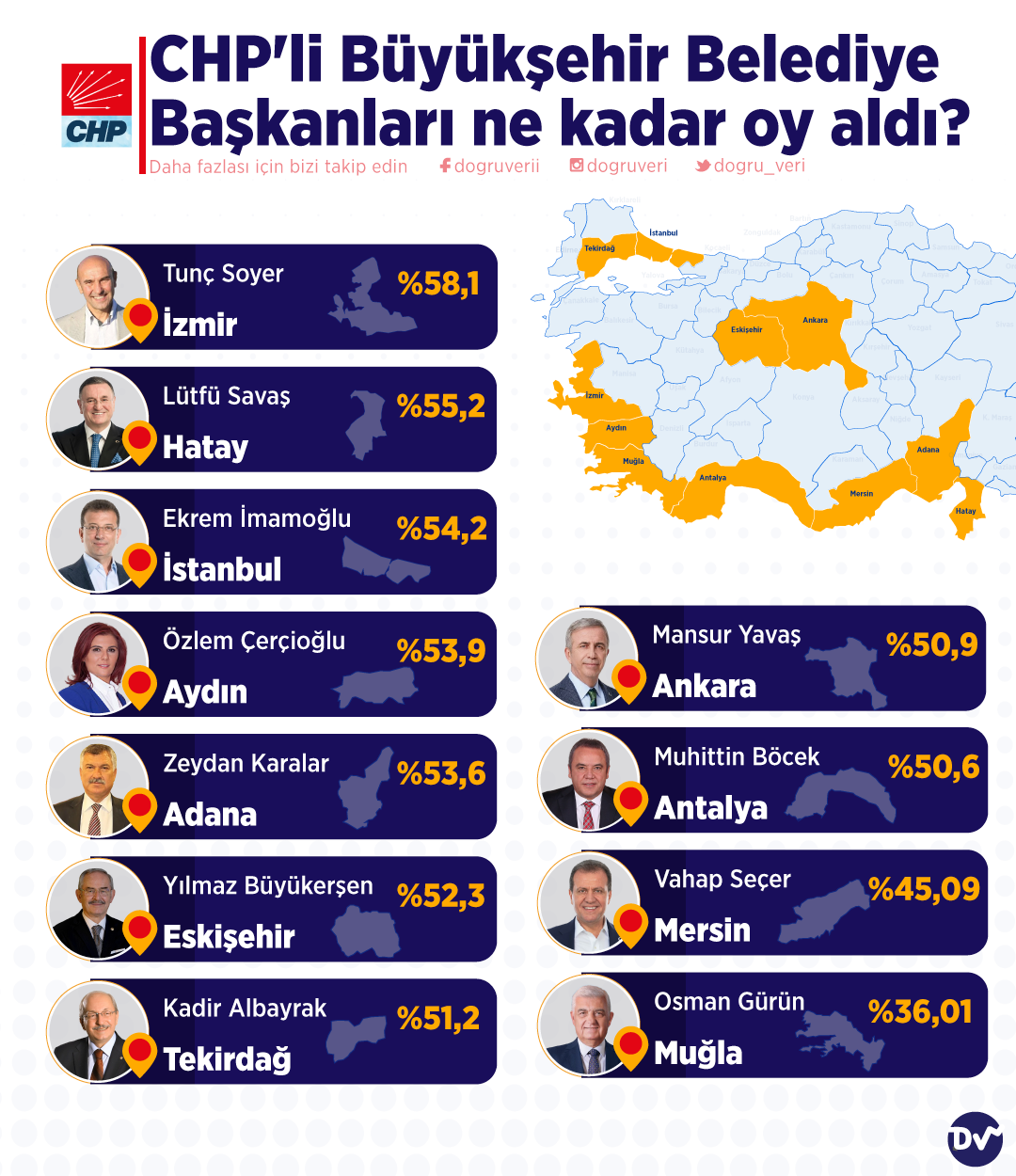 CHP’li büyükşehir belediye başkanlarının en son seçimde aldıkları oy oranlarını derledik. İzmir en çok oy oranına sahip büyükşehir oldu. Hatay, İstanbul ve Aydın; İstanbul’u takip eden iller oldu.