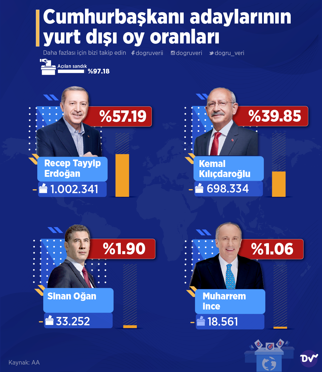 AnasayfaSeçim 2023Cumhurbaşkanı adaylarının yurtdışı oy oranlarıSeçim 2023Siyaset & Politika Cumhurbaşkanı adaylarının yurtdışı oy oranları Paylaş Cumhurbaşkanı adaylarının yurt dışı oylarını derledik. 89 Paylaş