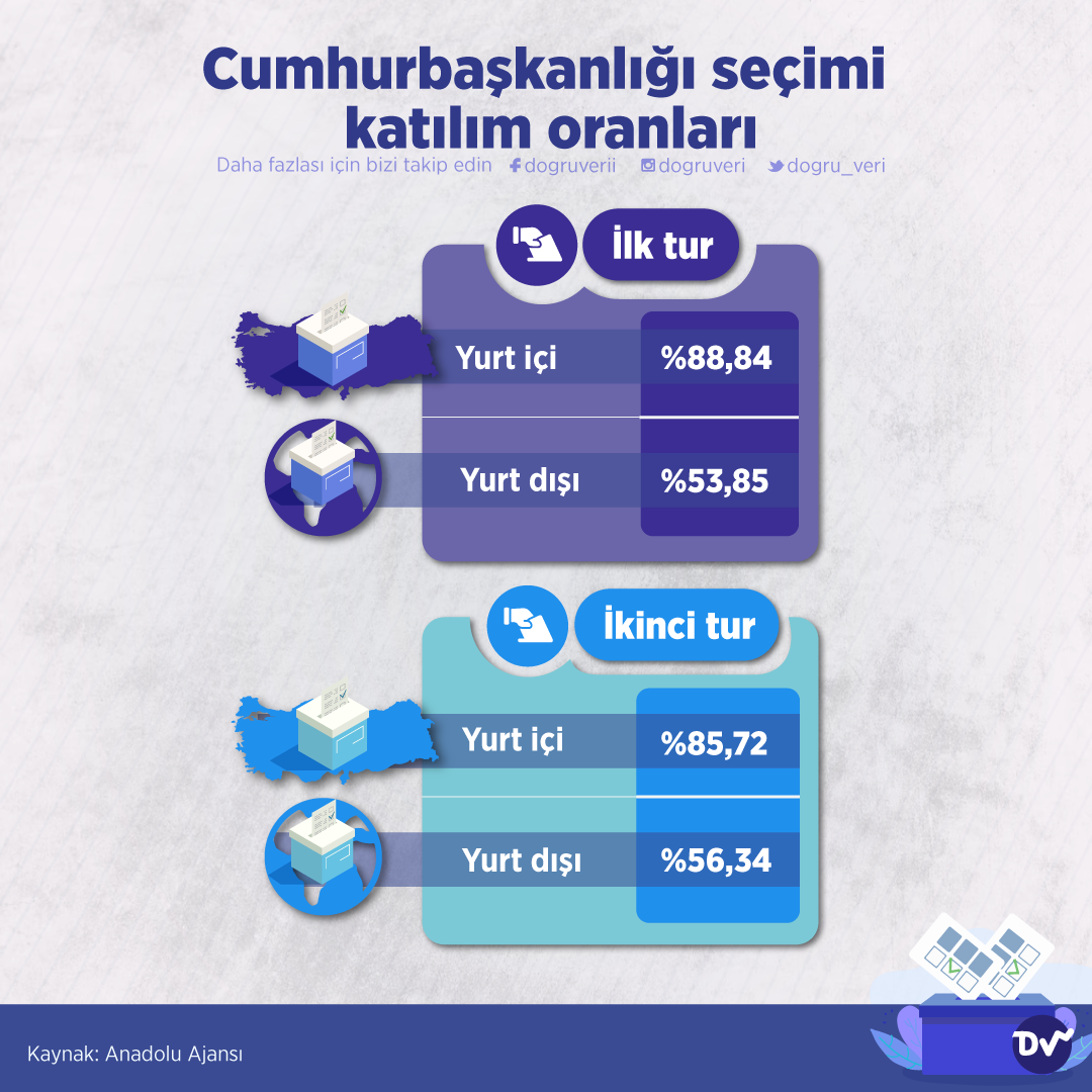 AnasayfaSeçim 2023Cumhurbaşkanlığı seçimi katılım oranlarıSeçim 2023Siyaset & Politika Cumhurbaşkanlığı seçimi katılım oranları Paylaş 14 Mayıs 2023’te ilk turu, 28 Mayıs 2023’te ise ikinci turu gerçekleşen Cumhurbaşkanlığı seçiminin yurt içi ve yurt dışı katılım oranlarını derledik. Buna göre, yurt içinde seçime katılım oranı %3,12 azalırken yurt dışında %2,49 artmış. 138 Paylaş