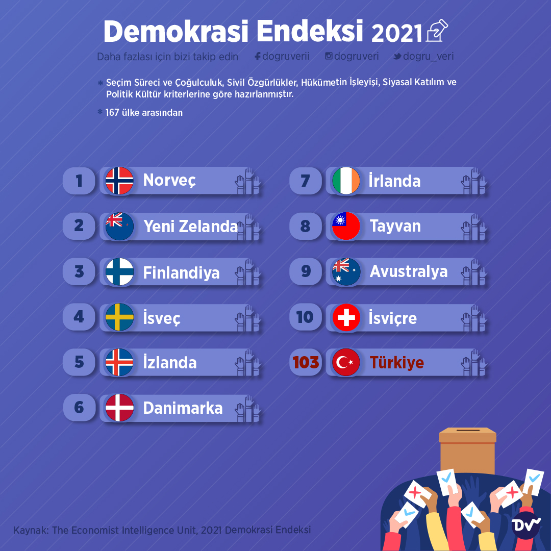 The Economist dergisi, 2021 yılının en demokratik ülkelerini listedi. 167 ülke; seçim süreci ve çoğulculuk, sivil özgürlükler, hükümetin işleyişi, siyasal katılım ve politik kültür kriterlerine göre sıralandı. Buna göre en demokratik ülkeler Norveç, Yeni Zelanda ve Finlandiya oldu. Türkiye ise tüm ülkeler arasında 103. sırada yer aldı.