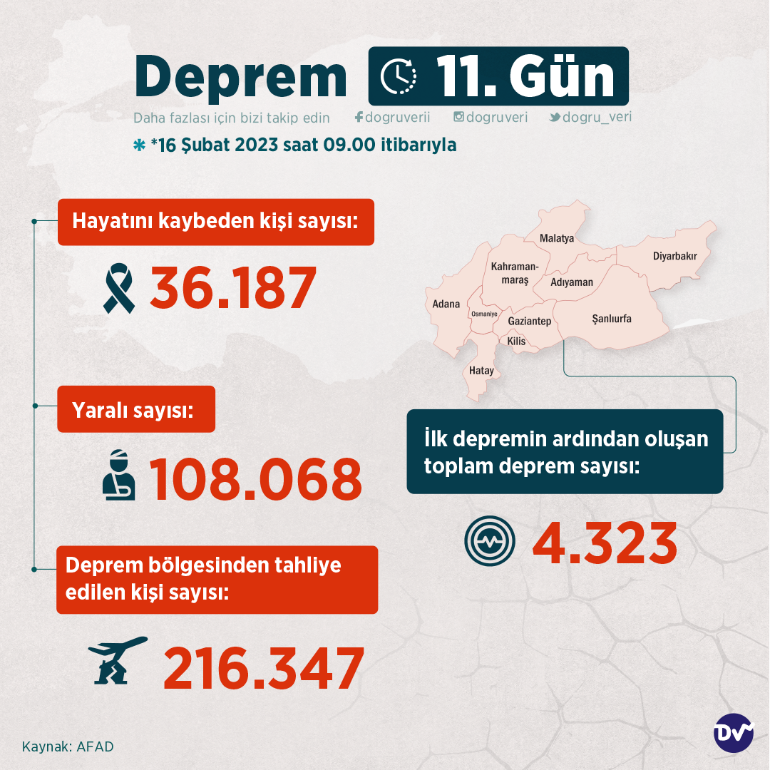 Yaşadığımız deprem felaketinin ardından 11. gündeyiz. Ne yazık ki hayatını kaybedenlerin sayısı artıyor. Bugün saat 09:00 itibarıyla yapılan açıklamaya göre son durum bu şekilde. Hepimizin başı sağ olsun. Yaklaşık 217 bin kişinin deprem bölgesinden tahliye edildiği görülüyor.