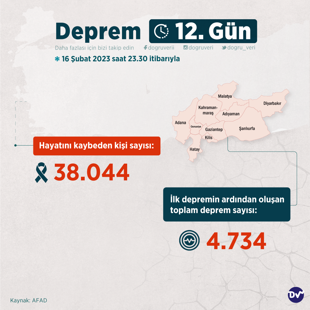 AnasayfaAfetDeprem 12. günAfet Deprem 12. gün Paylaş Yaşadığımız deprem felaketinin ardından 12. gündeyiz. Ne yazık ki hayatını kaybedenlerin sayısı artıyor. Dün saat 23:30 itibarıyla yapılan açıklamaya göre son durum bu şekilde. Hepimizin başı sağ olsun. 19 Paylaş