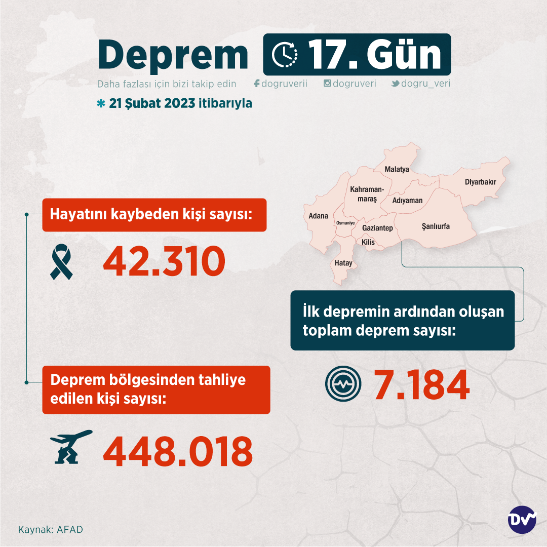 AnasayfaAfetDeprem 17. günAfet Deprem 17. gün Paylaş Yaşadığımız deprem felaketinin ardından 17. gündeyiz. Ne yazık ki hayatını kaybedenlerin sayısı artıyor. 21 Şubat 2023 itibarıyla açıklanan bilgilere göre, son durum bu şekilde. Hepimizin başı sağ olsun. 61 Paylaş