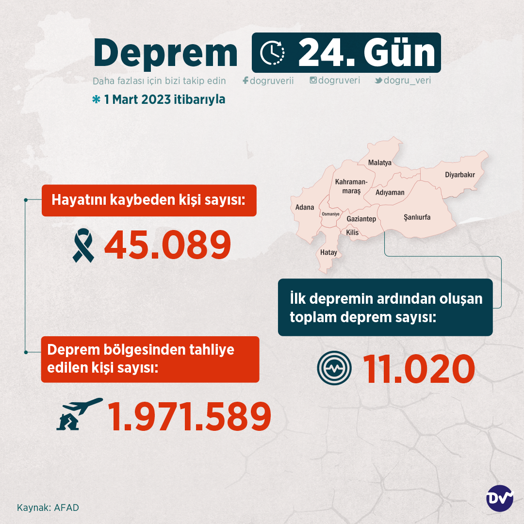 AnasayfaAfetDeprem 24. günAfet Deprem 24. gün Paylaş Yaşadığımız deprem felaketinin ardından 24. gündeyiz. Ne yazık ki hayatını kaybedenlerin sayısı artıyor. 1 Mart 2023 itibarıyla açıklanan bilgilere göre, son durum bu şekilde. Hepimizin başı sağ olsun. 50 Paylaş