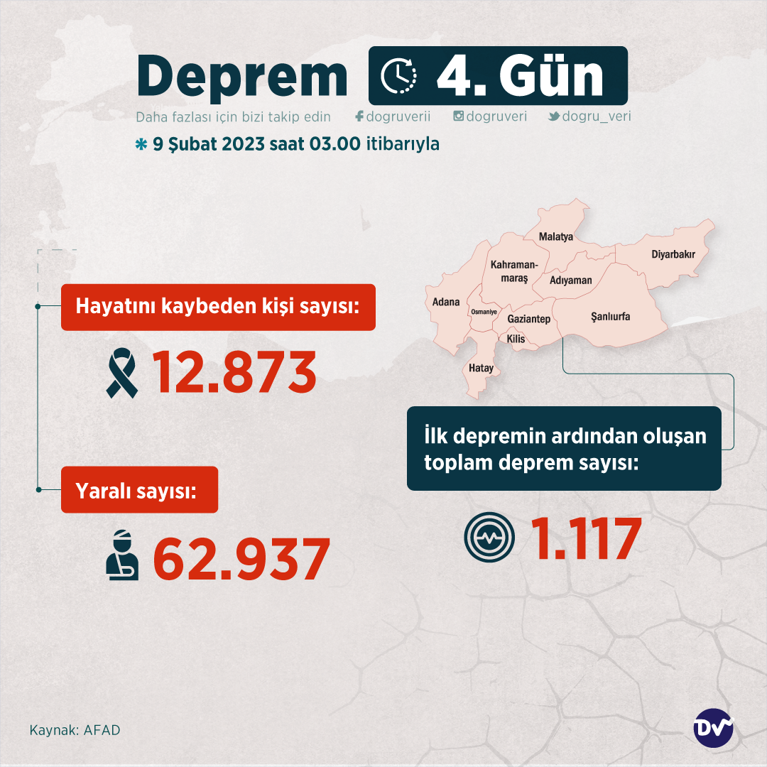 AnasayfaAfetDeprem 4. GünAfet Deprem 4. Gün Paylaş Yaşadığımız deprem felaketinin ardından 4. gündeyiz. Maalesef hayatını kaybedenlerin ve yaralıların sayısı artıyor. 9 Şubat 2023 saat 03:00 itibarıyla ilk depremin ardından oluşan toplam deprem sayısı ise 1117. Veriler değiştikçe güncellenecektir! 90 Paylaş