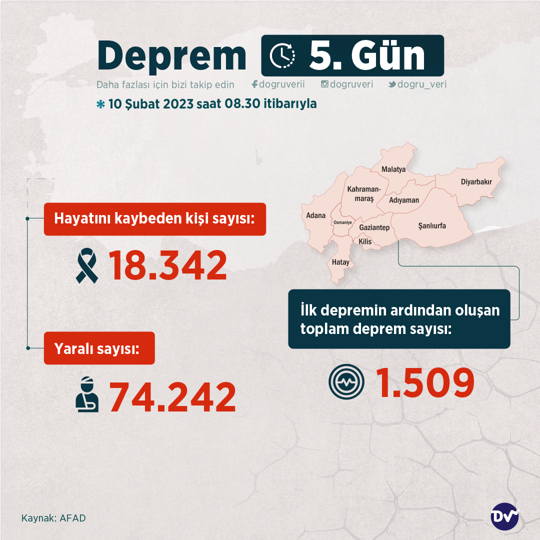 AnasayfaAfetDeprem 5. GünAfet Deprem 5. Gün Paylaş Yaşadığımız deprem felaketinin ardından 5. gündeyiz. Maalesef hayatını kaybedenlerin ve yaralıların sayısı artıyor. Başımız sağ olsun. Veriler değiştikçe güncellenecektir! 44 Paylaş