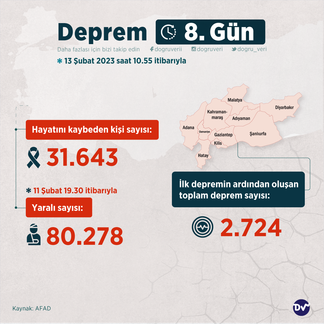 Yaşadığımız deprem felaketinin ardından 8. gündeyiz. Ne yazık ki hayatını kaybedenlerin sayısı artıyor. Hepimizin başı sağ olsun. Bugün saat 10:55 itibarıyla yapılan açıklamaya göre son durum bu şekilde. Yaralı sayısında henüz bir güncelleme yapılmadı.