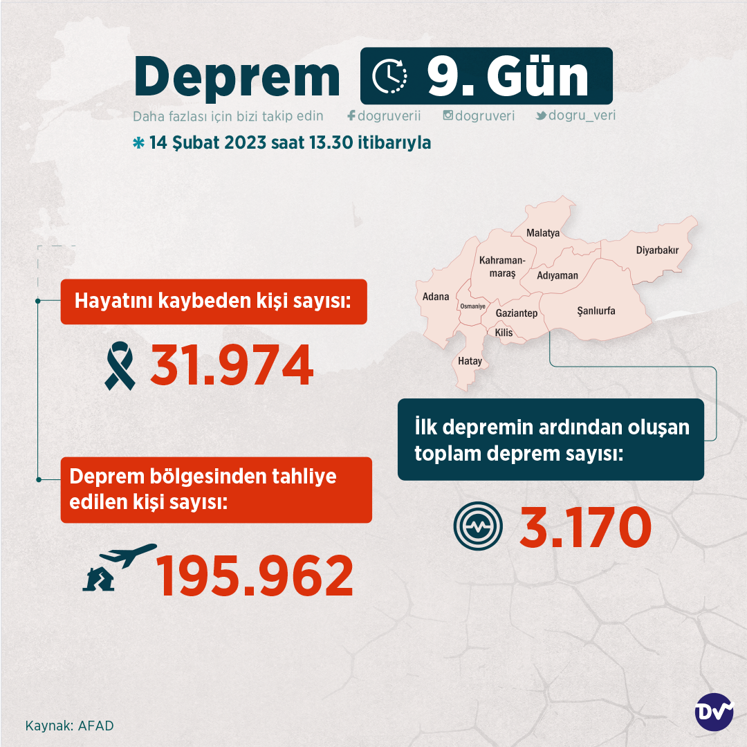 Yaşadığımız deprem felaketinin ardından 9. gündeyiz. Ne yazık ki hayatını kaybedenlerin sayısı artıyor. Bugün saat 13:30 itibarıyla yapılan açıklamaya göre son durum bu şekilde. Hepimizin başı sağ olsun. Yaklaşık 156 bin kişinin deprem bölgesinden tahliye edildiği görülüyor.