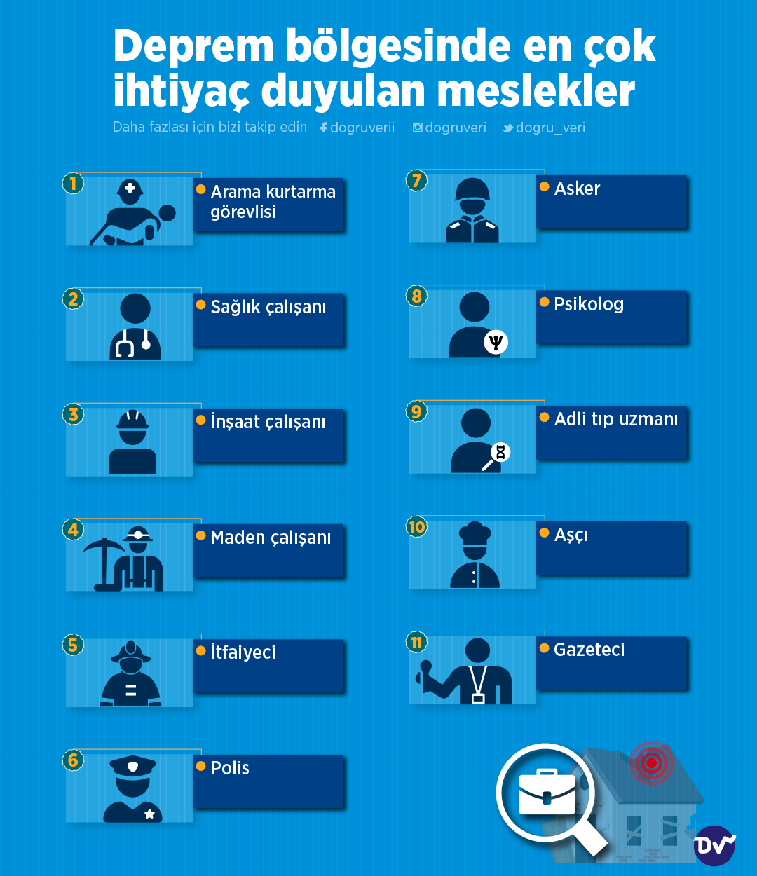 10 ilimizi etkileyen yıkıcı depremin ardından bölgede en çok ihtiyaç duyulan meslekleri araştırdık. Buna göre deprem bölgesinde en çok arama kurtarma görevlisi, sağlık çalışanı, inşaat çalışanı, maden çalışanı ve itfaiyeci gibi mesleklere ihtiyaç duyulmaktadır.