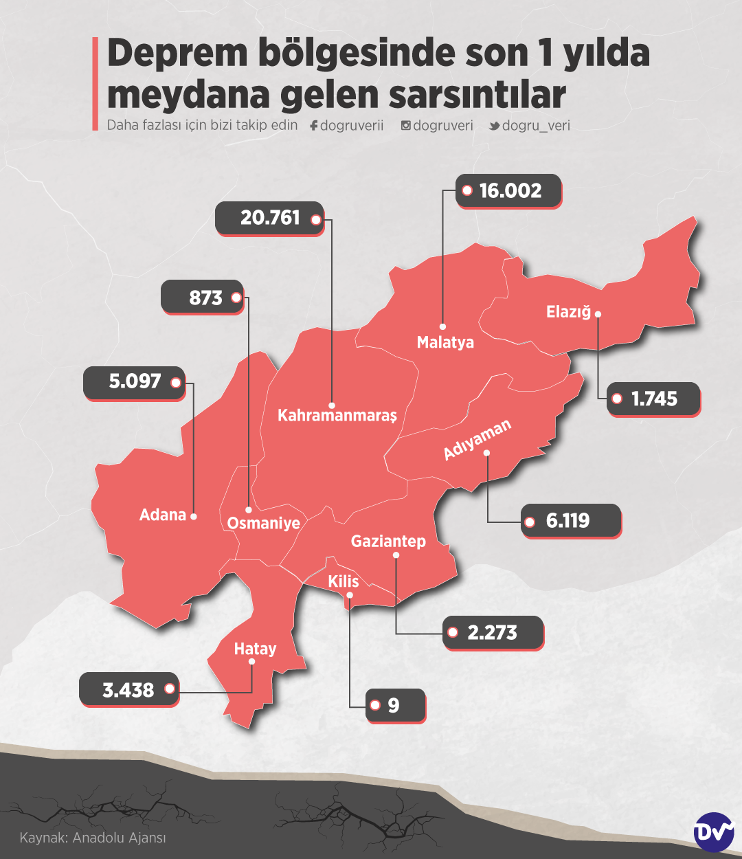 Anadolu Ajansı’nın derlemesinden yardım alarak Kahramanmaraş depremlerinin ardından bölgede son 1 yılda meydana gelen sarsıntı sayısını illere göre listeledik. Buna göre Kahramanmaraş’ta 20.761, Malatya’da 16.002, Adıyaman’da ise 6.119 deprem meydana gelmiş.