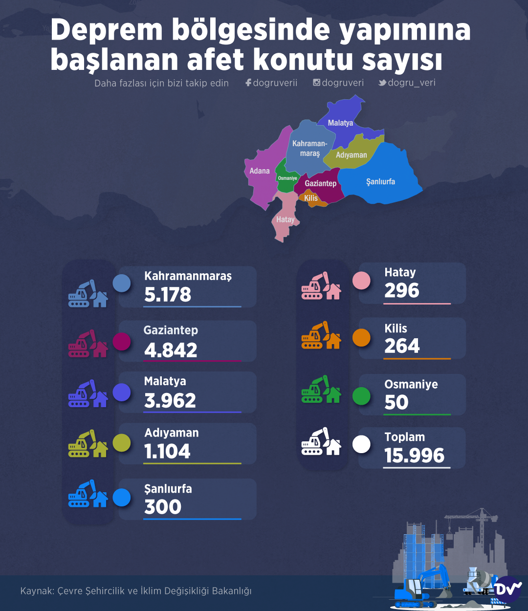 Çevre Şehircilik ve İklim Değişikliği Bakanlığı’nın 4 Mart’ta paylaştığı verilere göre, depremin ardından bölgede yapımına başlanan afet konutu sayılarını derledik. Buna göre Kahramanmaraş’ta 5.178, Gaziantep’te 4.842 ve Malatya’da ise 3.962 afet konutunun yapımına başlandığı görülüyor.
