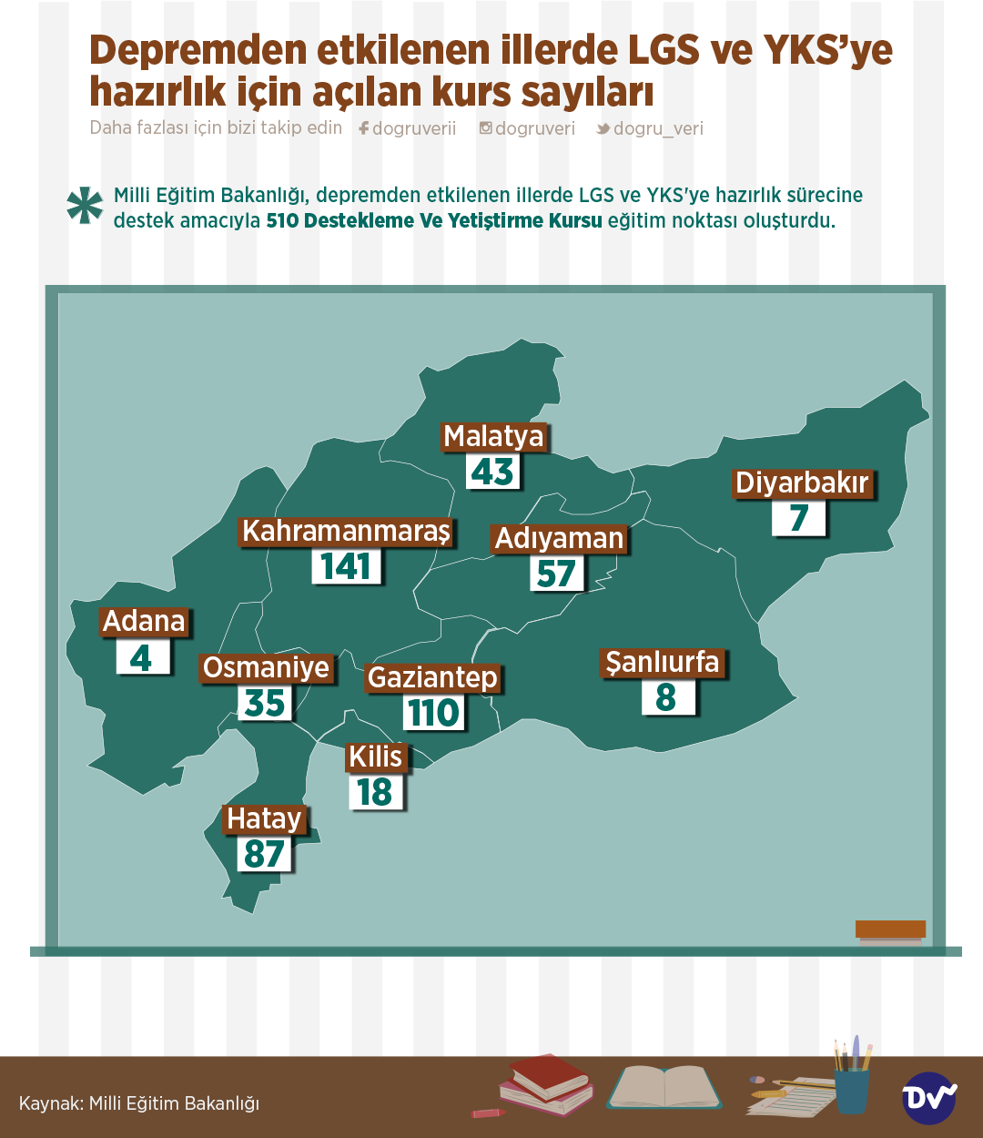 Milli Eğitim Bakanlığı’nın depremden etkilenen illerde LGS ve YKS’ye hazırlık sürecinde destek amacıyla oluşturduğu Destekleme ve Yetiştirme kurslarında eğitimler bugün başladı. Depremden etkilenen 10 ilimizde açılan Destekleme ve Yetiştirme kurslarının sayılarını sizin için derledik.
