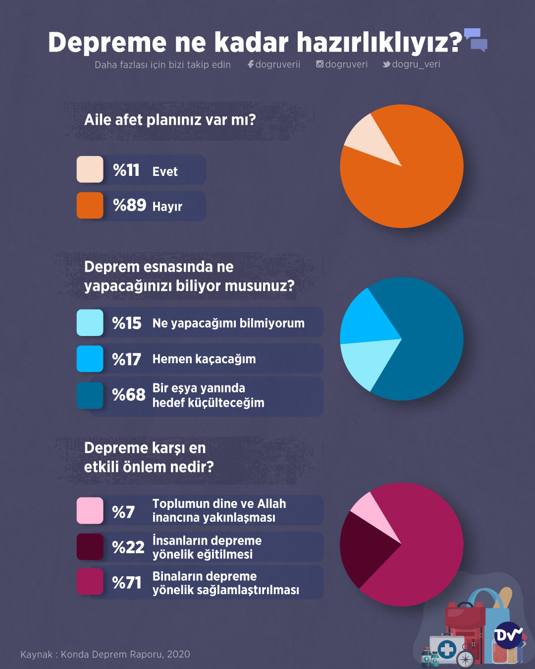 Yaşadığımız deprem felaketinin ardından zor günler geçirdiğimiz bugünlerde bir deprem ülkesi olarak deprem farkındalığımızı arttırmamız gerekiyor. Konda’nın 2020 yılında yaptığı araştırmaya göre, ankete katılan insanların büyük çoğunluğunun yaşanabilecek bir depreme karşı bir planı ya da hazırlığı yok.
