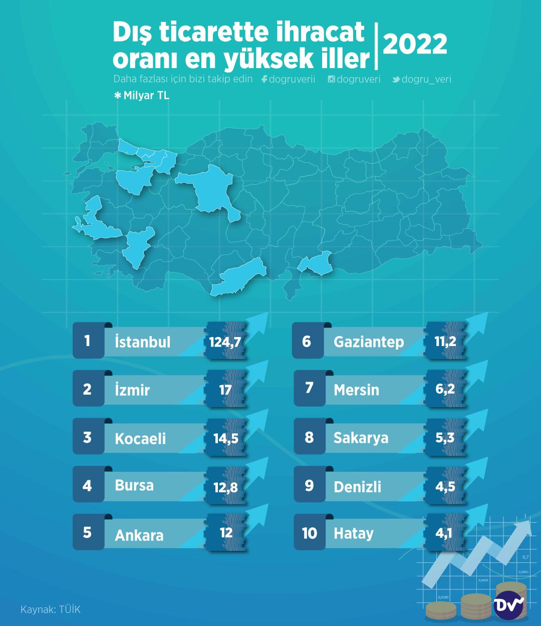 TÜİK’in 2022 verilerine göre, dış ticarette ihracat oranı en yüksek 10 ili derledik. İlk sırada 124,7 milyar TL ile İstanbul yer alırken İzmir, 17 milyar TL ile 2. sırada Kocaeli ise 14,5 milyar TL ile 3. sırada yer aldı.