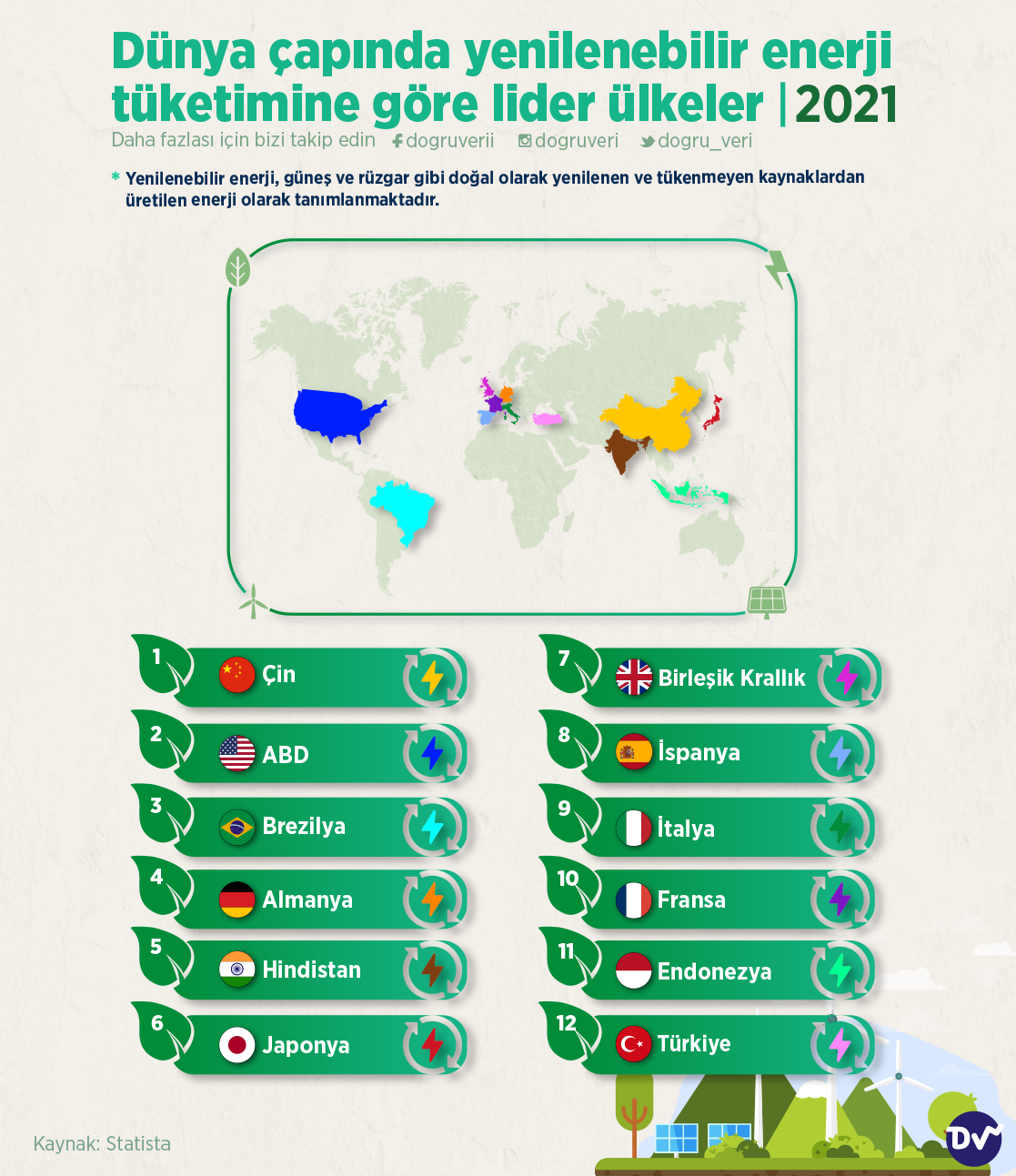 Yenilenebilir enerji tüketimine göre lider ülkeleri derledik. Listenin başında Çin yer alırken 2. sırada ABD ve 3. sırada Brezilya yer aldı. Türkiye ise listede 12. sırada yer aldı.