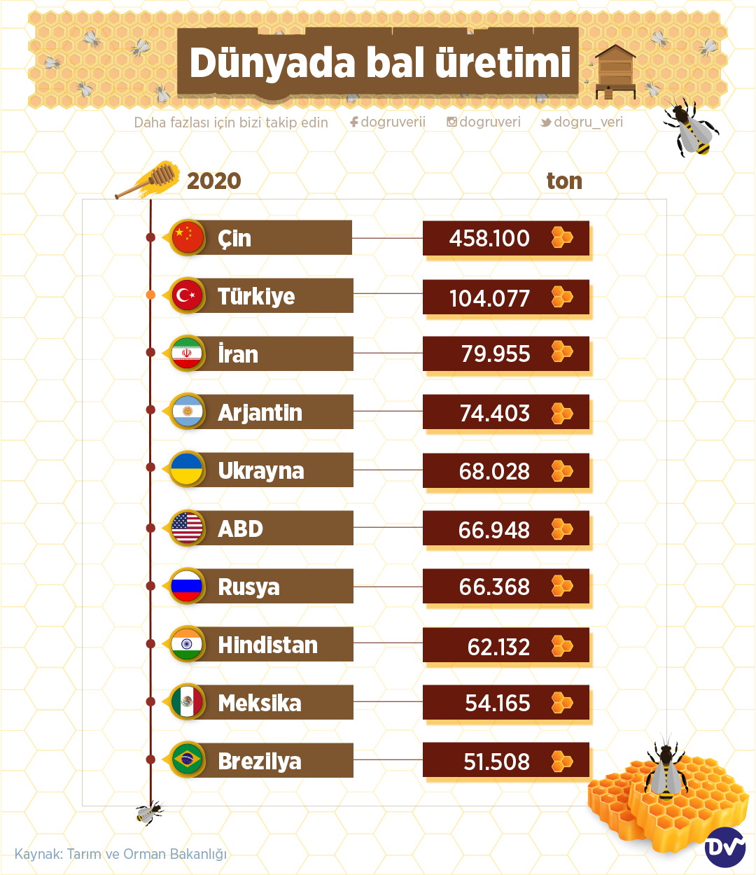 AnasayfaDiğerDünyada bal üretimiDiğer Dünyada bal üretimi Paylaş Bal üretiminde önde gelen ülkeleri sizin için derledik. Buna göre, Çin 458.100 ton üretimle listenin başında yer alırken Türkiye 104.077 ton üretimle listede 2. sırada ve İran 79.995 ton üretimle listede 3. sırada yer aldı. 266 Paylaş