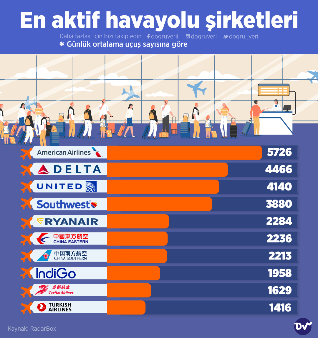AnasayfaTurizmDünyanın en aktif havayolu şirketleriTurizm Dünyanın en aktif havayolu şirketleri Paylaş Günlük ortalama uçuş sayısına göre en aktif havayolu şirketleri araştırdık. American Airlines günlük 5726 uçuşu ile en aktif havayolu şirketi olarak karşımıza çıkıyor. Listede 1416 uçuşla Türk Hava Yolları da bulunuyor. 87 Paylaş