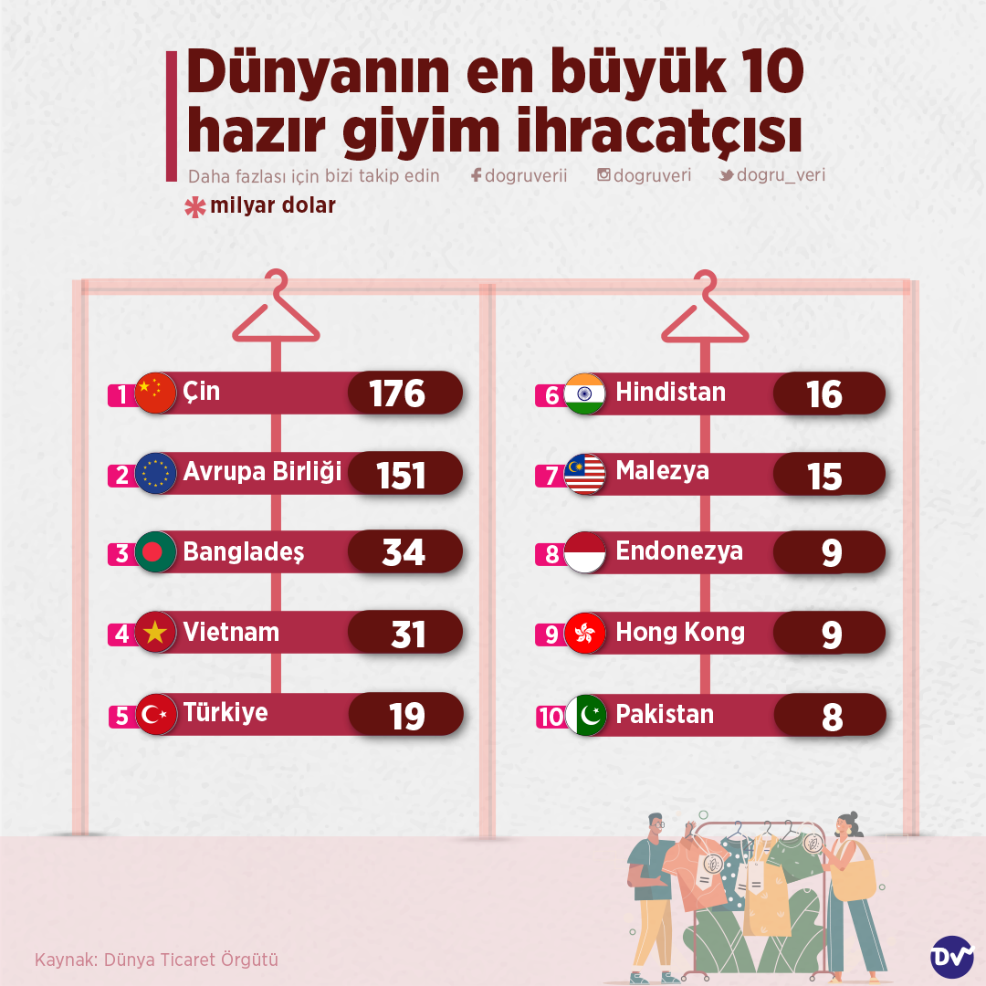 AnasayfaEkonomiDünyanın en büyük 10 hazır giyim ihracatçısı I 2021Ekonomi Dünyanın en büyük 10 hazır giyim ihracatçısı I 2021 Paylaş Dünya Ticaret Örgütü’nün verilerine göre dünyanın en büyük 10 hazır giyim ihracatçısını derledik. Türkiye’nin 5. sırada yer aldığı listenin başında Çin, Avrupa Birliği ve Bangladeş geliyor. 82 Paylaş