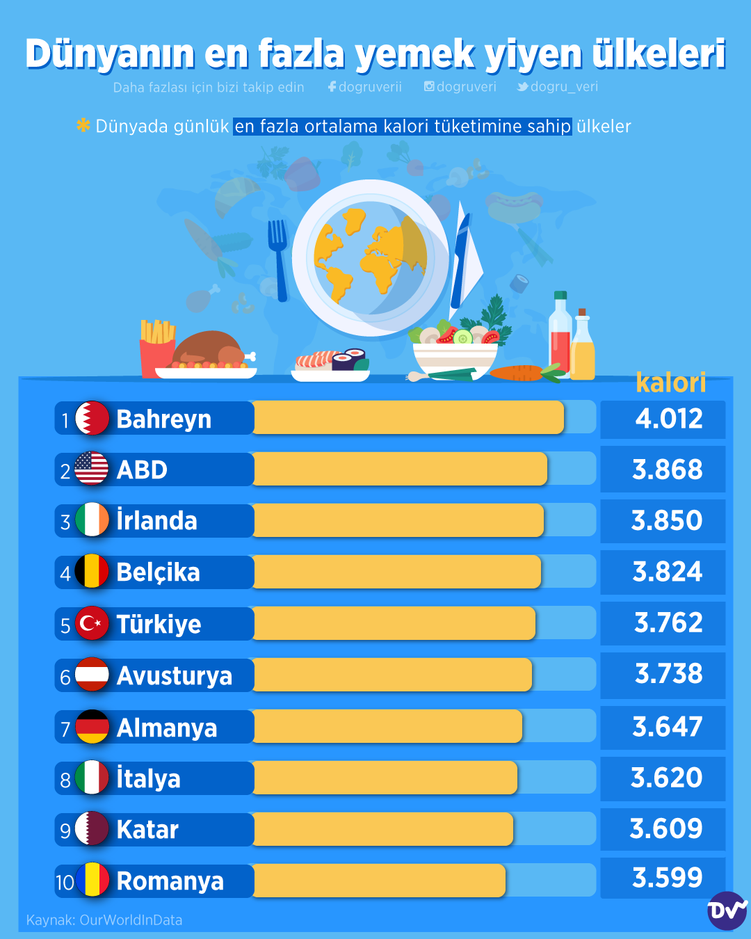 OurWorldInData, dünyanın en fazla yemek yiyen ülkelerini açıkladı. 184 ülkenin bulunduğu listenin verilere göre Türkiye, 3.762 kaloriyle 5. sırada yer aldı. Listenin 1. sırasında Bahreyn yer alırken ABD 2,İrlanda 3, Belçika ise 4. sırada listeleniyor.