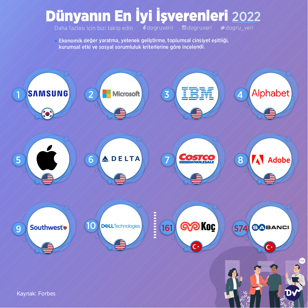 Forbes, dünyanın en iyi işverenlerini açıkladı. Güney Koreli teknoloji şirketi Samsung ilk 10’da Amerikalı olmayan tek marka ve ilk sırada. 2-10 arasındaki markaların tamamı Amerikan: Microsoft, IBM, Alphabet, Apple, Delta, Costco, Adobe, Southwest ve Dell.