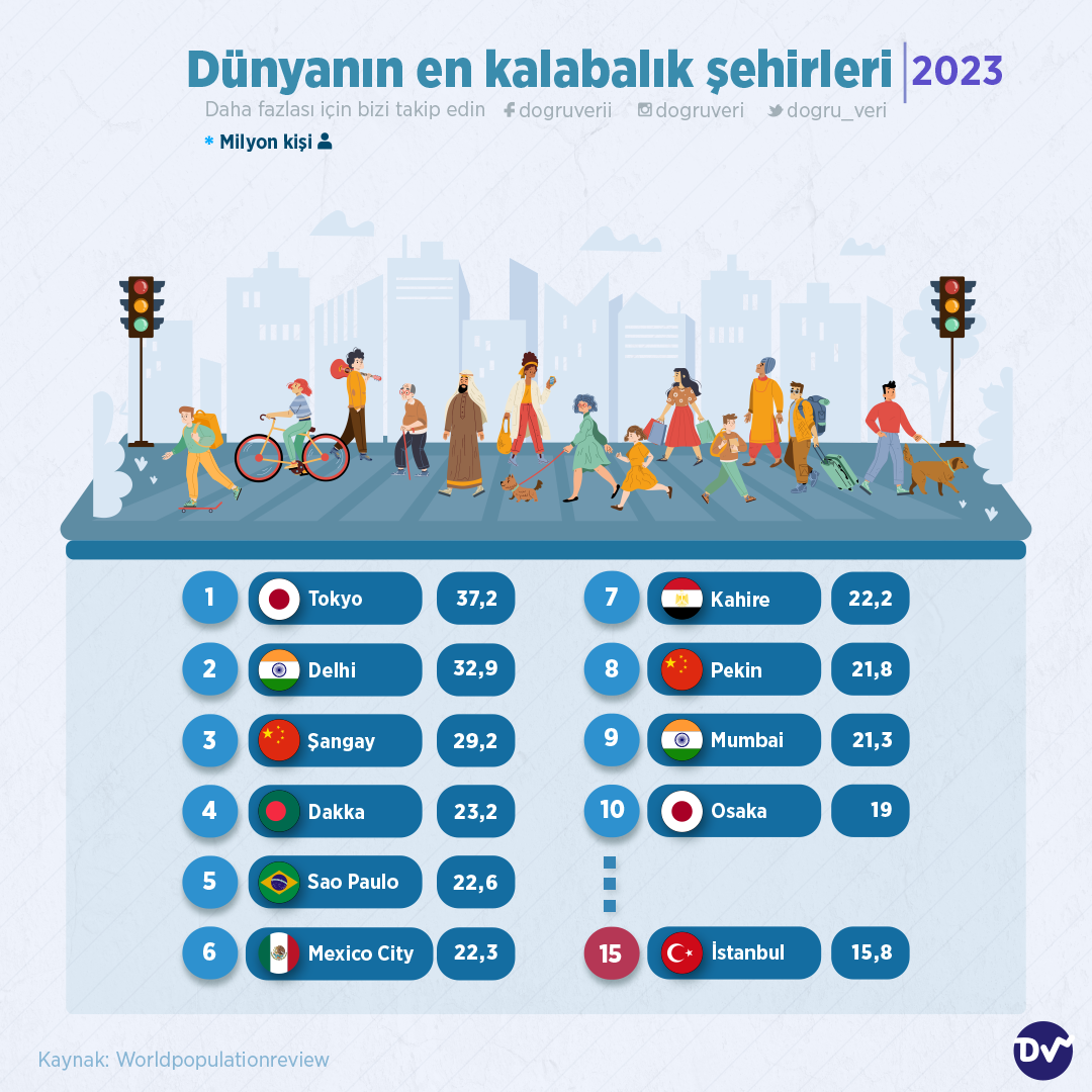 Dünyanın en çok nüfusa sahip şehirlerini sizin için derledik. Derlemeye göre en kalabalık şehirlerin nüfusları şu şekilde: Tokyo 37,2 milyon, Delhi 32,9 milyon, Şangay 29,2 milyon, Dakka 23,2 milyon, Sao Paulo 22,6 milyon, Mexico City 22,3 milyon, Kahire 22,2 milyon, Pekin 21,8 Mumbai 21,3 milyon, Osaka 19 milyon ve İstanbul 15,8 milyon.