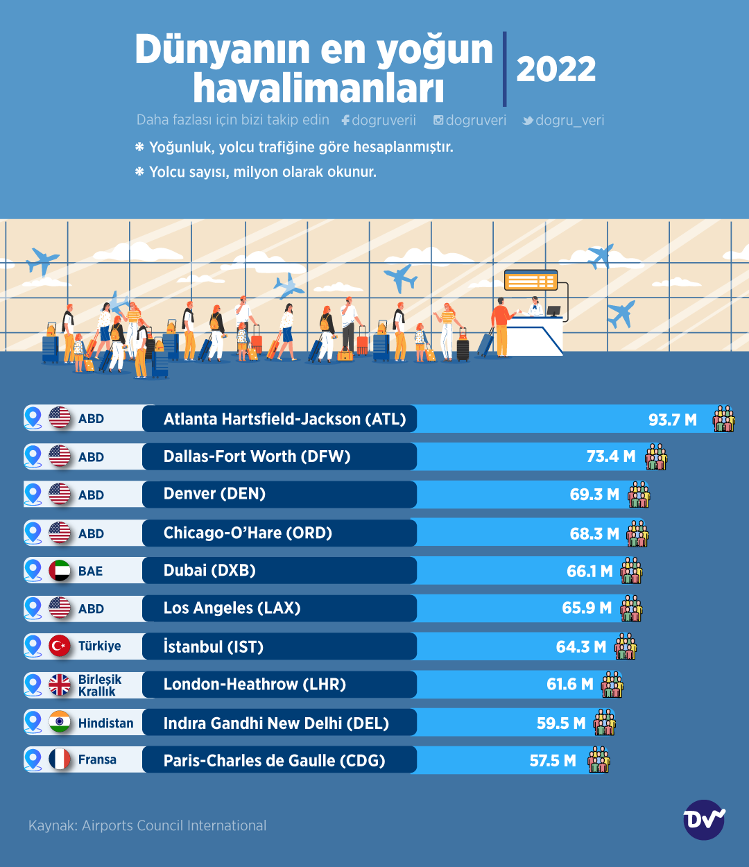 AnasayfaDiğerDünyanın en yoğun havalimanları I 2022Diğer Dünyanın en yoğun havalimanları I 2022 Paylaş 2022 yılında kaydedilen yoğunluk-yolcu trafiği verilerine göre, dünyanın en yoğun havalimanlarını derledik. 32 Paylaş