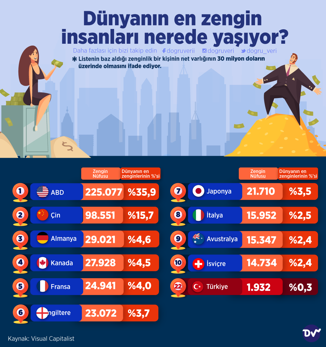 AnasayfaDiğerDünyanın en zengin insanları nerede yaşıyor?Diğer Dünyanın en zengin insanları nerede yaşıyor? Paylaş Visual Capitalist’in verilerine göre dünyanın en zengin insanlarının nerelerde yaşadıklarını listeledik. Zenginlerin %35’i ABD’de, %15’i Çin’de, %4’ü ise Almanya’da yaşıyor. Türkiye’de ise bu oran %0,3. 27 Paylaş