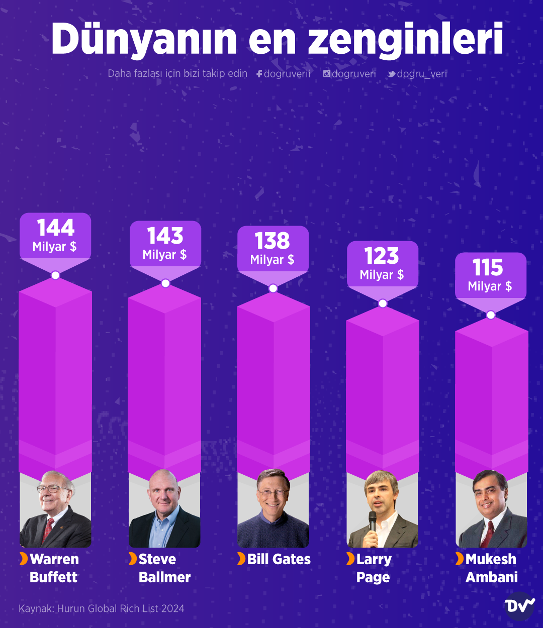 Hurun Global Rich List 2024’e göre dünyanın en zengin kişilerini sıraladık. Listenin başında herkesin yakından tanıdığı Elon Musk yer alıyor. Musk’ın 231 milyar dolarlık serveti bulunuyor. Jeff Bezos, Mark Zuckerberg ve Bill Gates gibi isimler de dünyanın en zengileri arasında.