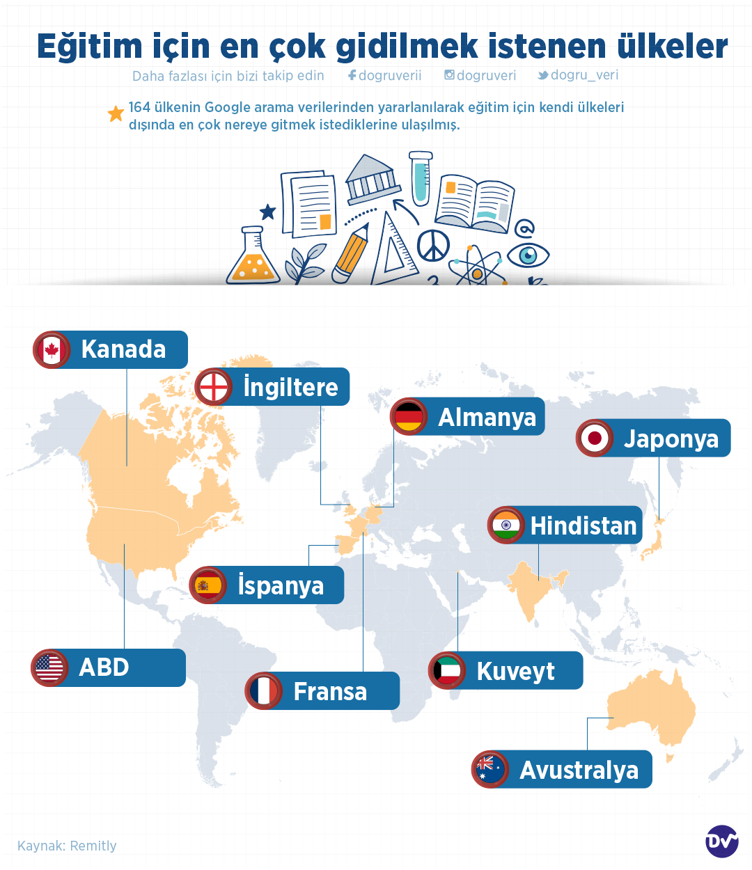 Kendi ülkesinin dışında eğitim almak isteyen öğrenciler, eğitim öğretimlerine başka ülkede devam etme isteğinde bulunabiliyor. Yurt dışında eğitim için en çok tercih edilen ülkeleri sizler için derledik. 164 ülkenin Google arama verilerinden elde edilen bilgilerle hazırlanan listede; Kanada, İspanya, İngiltere, Japonya gibi ülkeler yer alıyor.